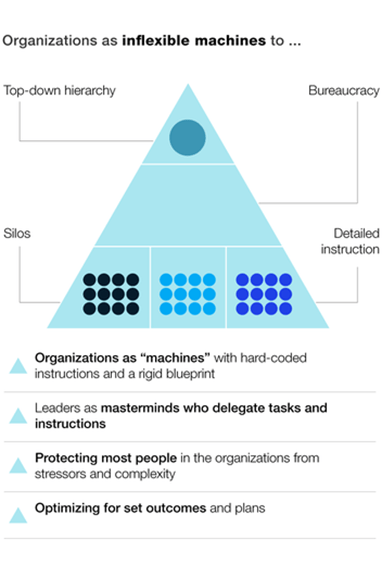 Bewegen naar zo’n organisatiestructuur vraagt om een verschuiving van ‘the old story’ (Stephanie Pace Marshall) naar een nieuw verhaal: één waarin wij de organisatie minder beschouwen als een machine en meer als een levend systeem. Het idee van een organisatie beschouwen als een machine komt voort uit onze behoefte aan controle. Het geeft ons een veilig gevoel dat wij het idee hebben dat we uitkomsten kunnen voorspellen. Aangezien onze uitkomsten geïnspecteerd worden en onze kwaliteit beoordeeld wordt is het niet vreemd dat wij in het onderwijs vaak kiezen voor een machinale organisatievorm.