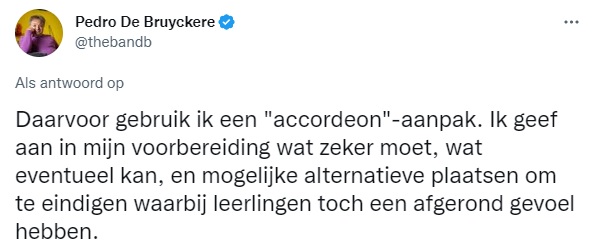 Maar… hoe goed je voorbereiding ook is, een les zal nooit precies lopen zoals van tevoren bedacht. De ‘accordeon’-aanpak van Pedro De Bruyckere is dan een goede tip.