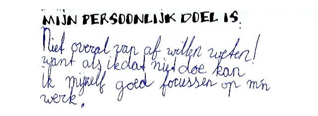 Dit formulier print ik dubbelzijdig uit (het heeft nog een achterkant), op A3-formaat, en laat ik vervolgens door de leerlingen invullen. Tijdens deze studieles loop ik rond en waar nodig help ik leerlingen met de rechterkant van het formulier. Het formuleren van goede doelen is, zoals ik al heb genoemd, vaak nog moeilijk voor leerlingen.