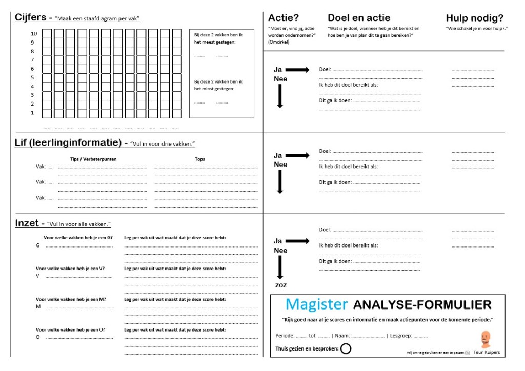 Ik maak hiervoor graag gebruik van een Magister Analyse formulier. Leerlingen die dit formulier gebruiken starten namelijk met het verzamelen en interpreteren van informatie die zij, in het geval van mijn school, kunnen ophalen uit Magister.
