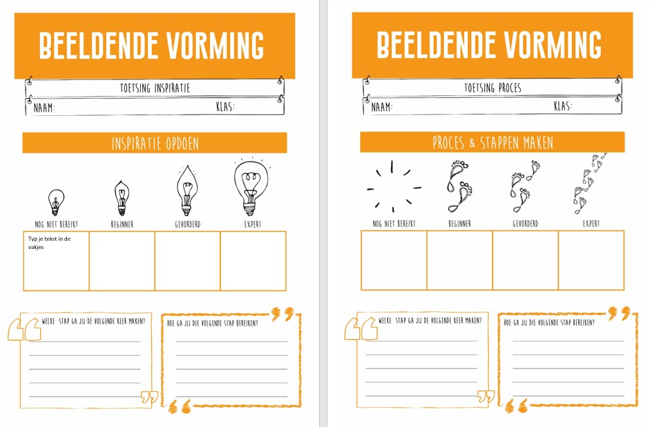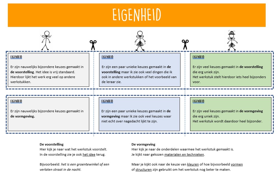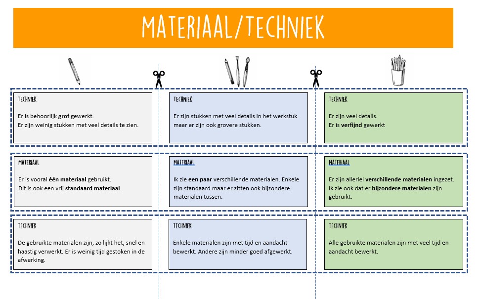 Het is voor leerlingen ontzettend belangrijk dat de tekstjes in de rubric worden voorzien van voorbeelden. Want wat doet een beginnend verbeelder? En hoe ziet het materiaalgebruik er uit van een expert? Hier komt werken aan kwaliteitsbesef om de hoek kijken.