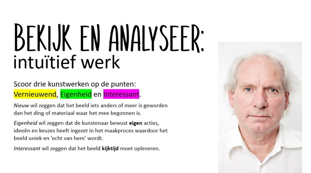 Als startopdracht vraag ik de leerlingen om op een wisbordje te schrijven wat zij denken dat intuïtief werken is. “Wat“, zo vraag ik, “doet een kunstenaar of vormgever die intuïtief werkt?“